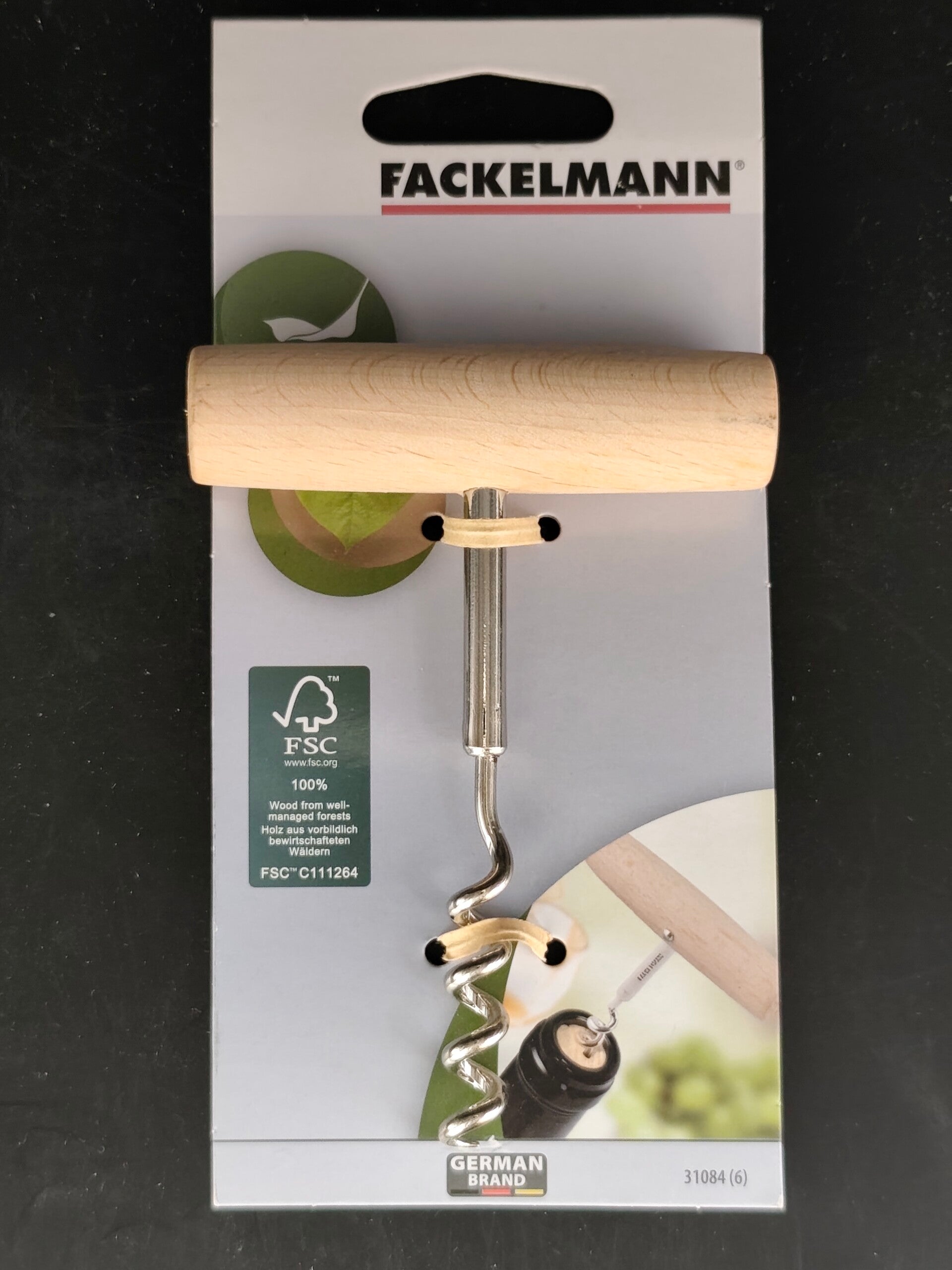 1× Fackelmann Korkenzieher Nature (T-Form, wahlweise hell oder dunkel)