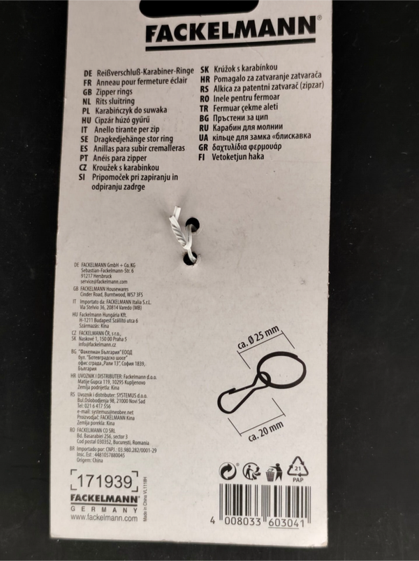 Die Fackelmann Reißverschluss-Karabiner-Ringe sind praktische Ersatzteile, wenn ein Zipper oder Anhänger am Reißverschluss verloren geht oder beschädigt ist. Sie lassen sich einfach einhängen und sorgen dafür, dass Jacken, Taschen oder Rucksäcke wieder komfortabel geöffnet und geschlossen werden können.